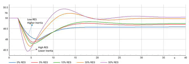 - System Limits Calculation: Derive minimum kinetic energy for a given RoCoF limit and credible loss, compute nadir and quasi-steady-state deviations, and include virtual inertia from grid-forming units.